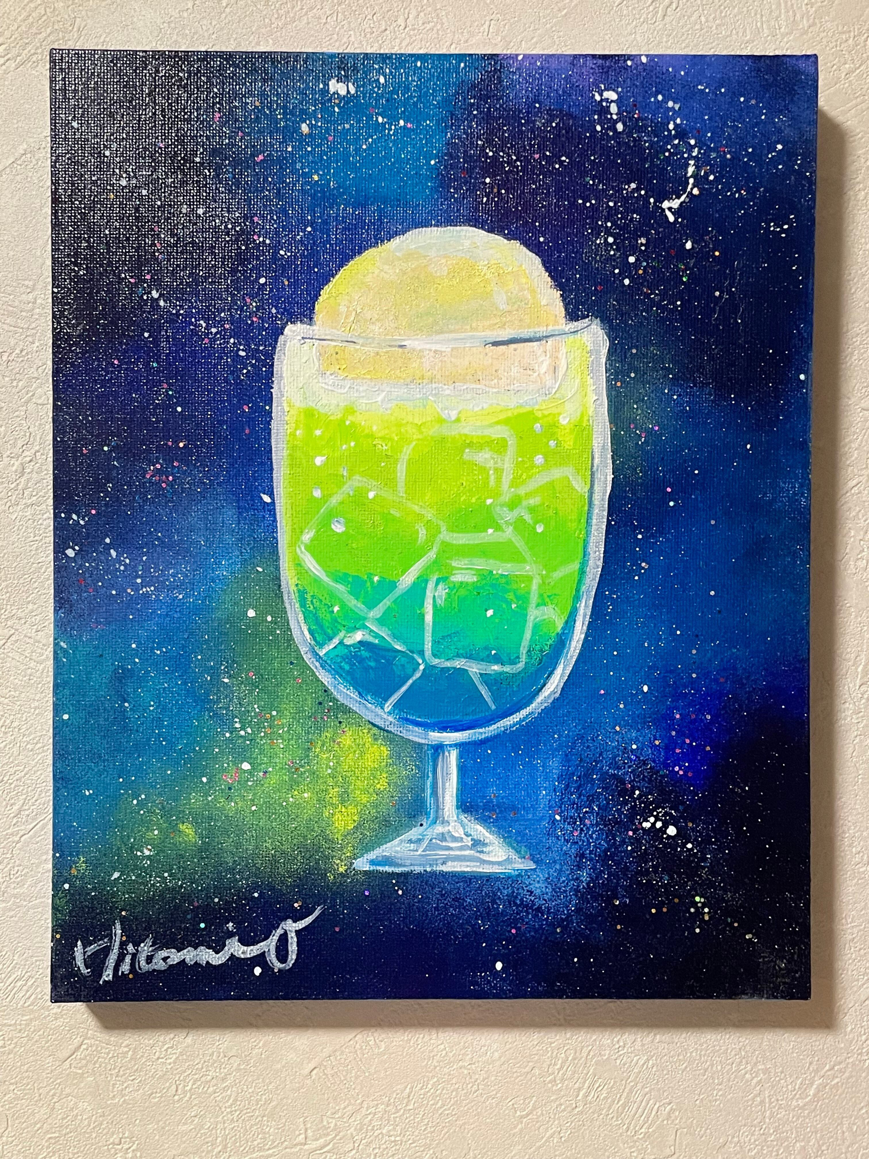 【A-145/25】【個展展示】原画 絵画  クリームソーダ 抽象画 夜空 キャンバス 真作 インテリア 作品証明書付 アート 現代アート