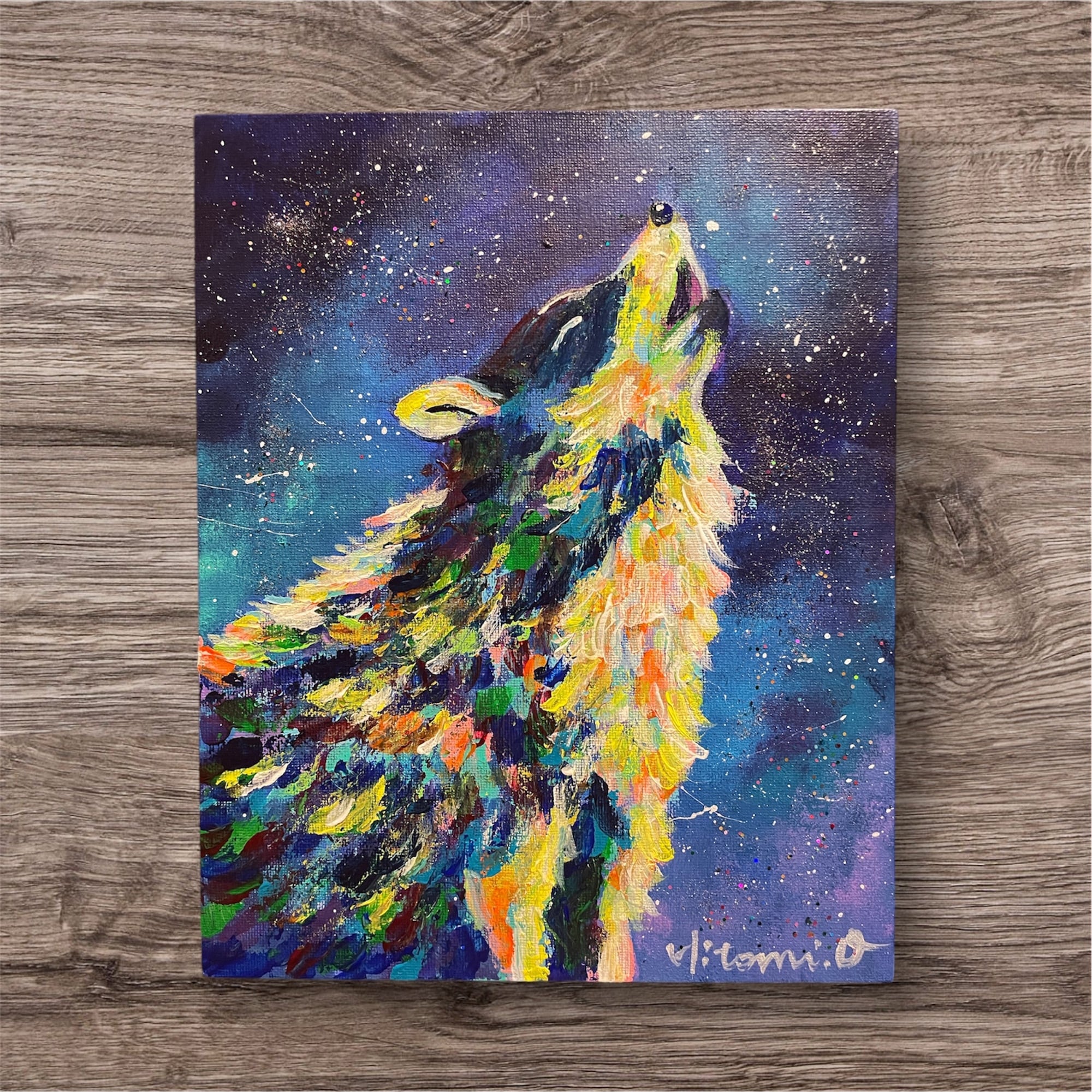 【A-53/26】原画 絵画 動物画 オオカミ カラフル キャンバス 真作 インテリア 作品証明書付 アート 現代アート