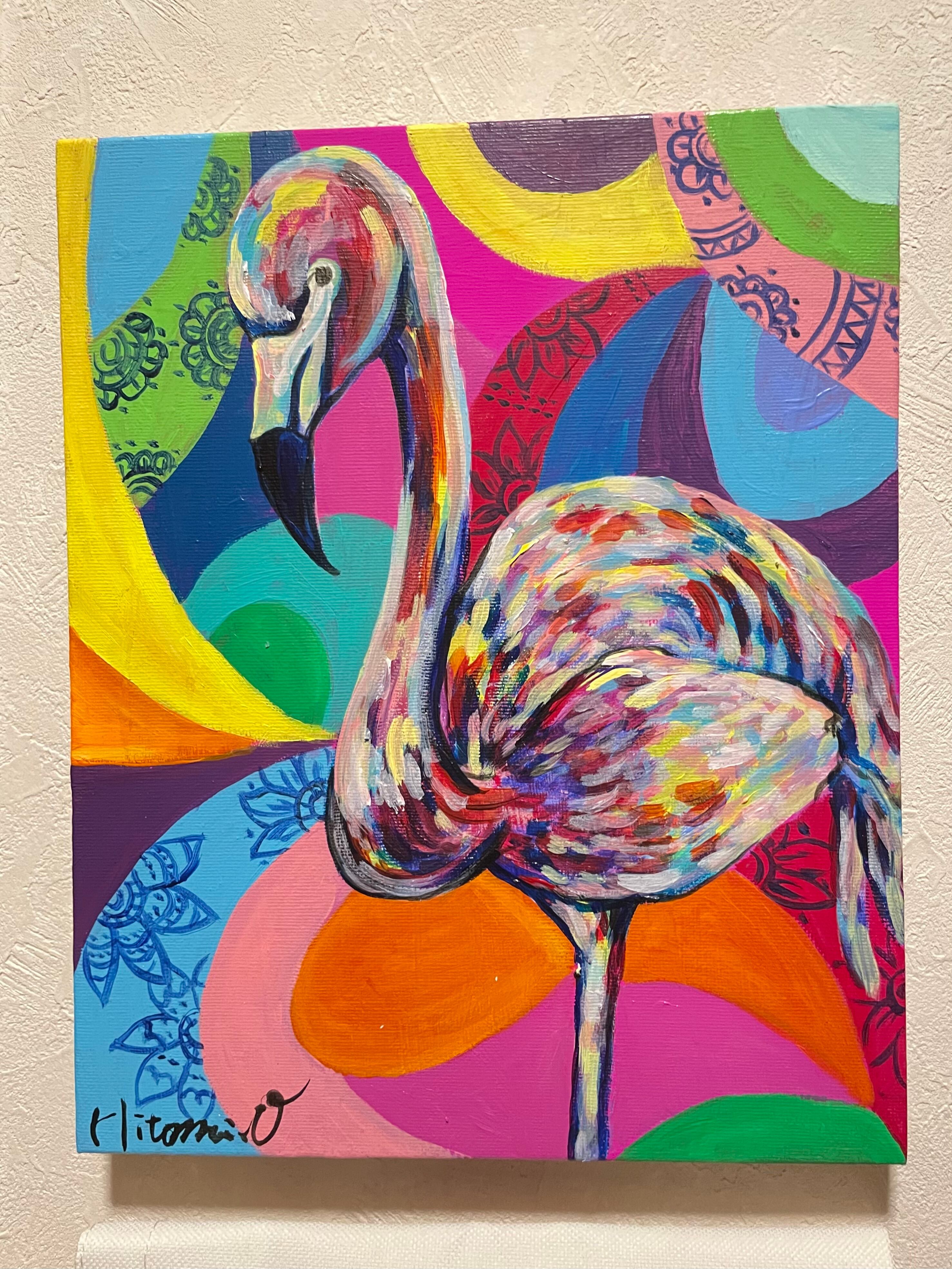 【A-125/23】アクリル画 原画 絵画 現代アート キャンバス 真作 動物画 フラミンゴ